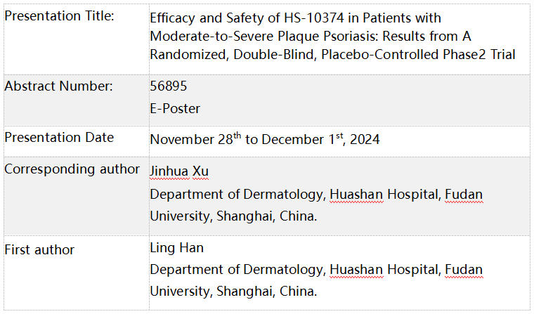 The presentation reports the Phase II clinical trial results. HS-10374 showed significant clinical efficacy versus Placebo (PBO) in terms of PASI 75 response rate and sPGA 0/1 response rate with oral doses of 6 mg QD or 12 mg QD in patients with moderate-to-severe plaque psoriasis. The overall safety profile was similar to other TYK2 inhibitors, as adverse events of“skin and subcutaneous disorders” in this study were more commonly reported in PBO group. Ongoing Phase 3 Trial (CTR20243822) with a longer treatment duration and larger populations will further confirm the efficacy and safety of HS-10374 (12mg QD)in such patients.